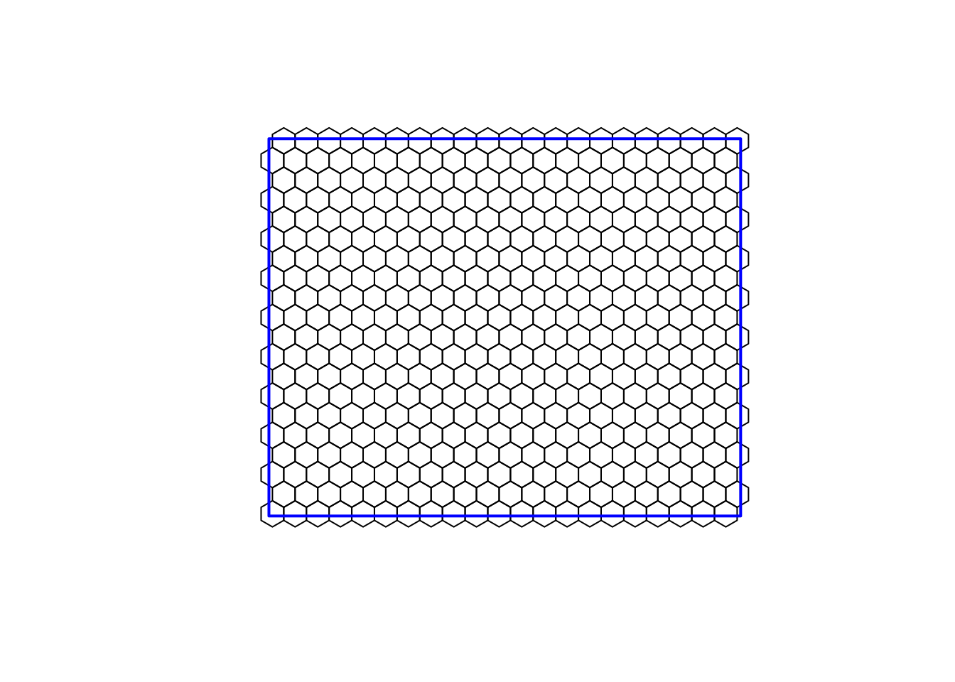 # Projection in lambersprojSpat<-"+proj=lcc +lat_1=46 +lat_2=60 +lat_0=44 +lon_0=-68.5 +x_0=0 +y_0=0 +datum=NAD83 +units=m +no_defs +ellps=GRS80 +towgs84=0,0,0"# Bounding boxlatmax<-625000latmin<-585000lonmax<-150000lonmin<-100000# Create a spatial bounding box for the area of interest using the 'sp' package:bb<-cbind(c(lonmin,lonmax,lonmax,lonmin,lonmin),c(latmin,latmin,latmax,latmax,latmin))%>%Polygon()%>%list()%>%Polygons(ID='ID1')%>%list()%>%SpatialPolygons(proj4string=CRS(projSpat))# Create spatial grid that will be used for intersectsA<-5*1000000# Surface of cells in m^2 (area in km^2 * 1000000)cellsize<-sqrt(2*A)/3^(1/4)# value of the small diagonalgrid<-sp::spsample(bb,type="hexagonal",cellsize=cellsize,offset=c(0,0))%>%# Points for a hexagonal gridsp::HexPoints2SpatialPolygons()# creating polygons# We now have a grid of polygons to work with!plot(grid)lines(bb,col='blue',lwd=2)