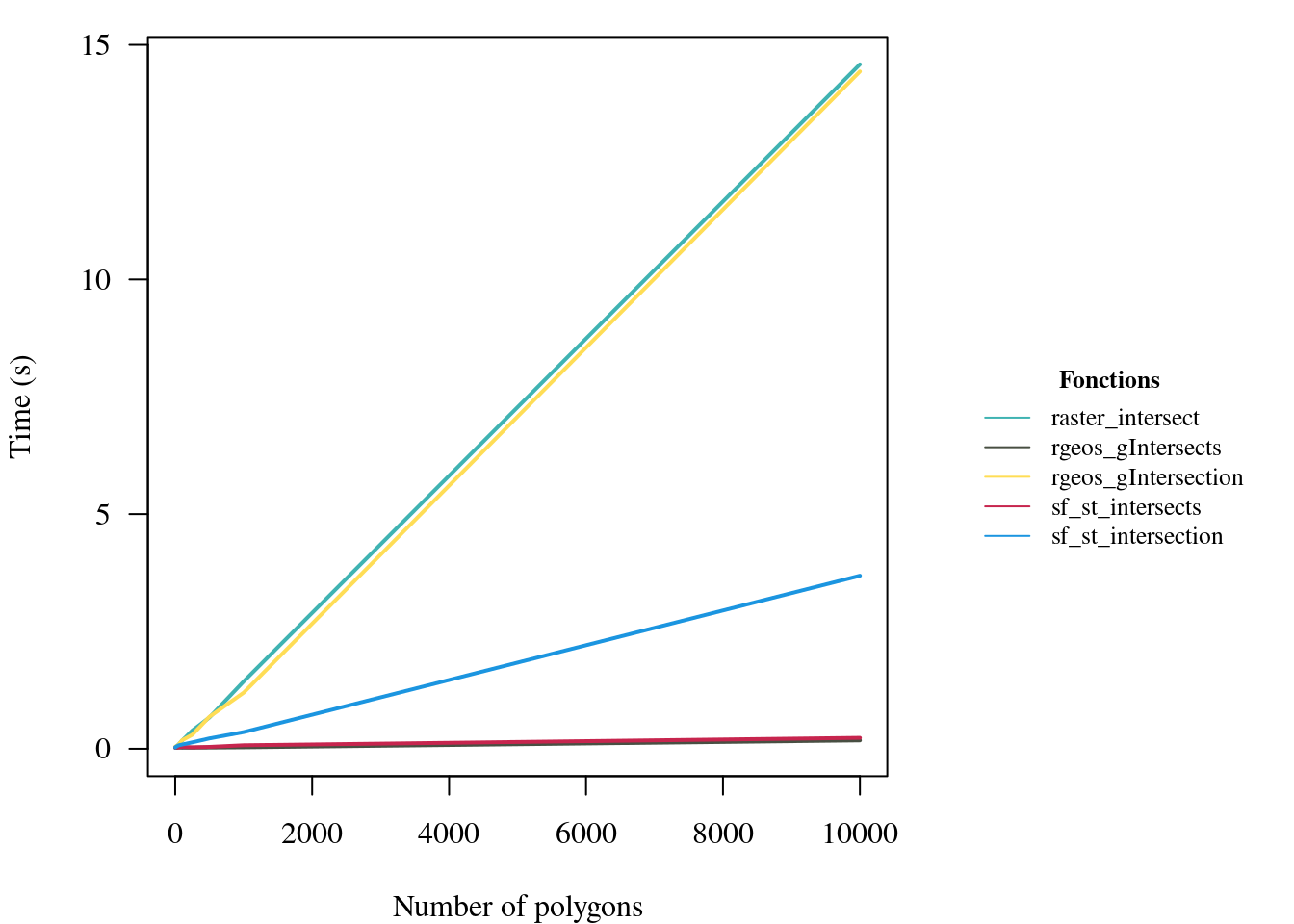 # Visualize resultslayout(matrix(c(1,2),ncol=2),widths=c(5,2),heights=3)par(mar=c(4,4,1,1),las=1,family="serif")##plot(res2$raster_intersect~res2$n,type='l',lwd=2,col=cols[1],ylim=c(0,max(res2[,2:6])),xlab='Number of polygons',ylab='Time (s)')lines(res2$rgeos_gIntersects~res1$n,lwd=2,col=cols[2])lines(res2$rgeos_gIntersection~res2$n,lwd=2,col=cols[3])lines(res2$sf_st_intersects~res2$n,lwd=2,col=cols[4])lines(res2$sf_st_intersection~res2$n,lwd=2,col=cols[5])# Legendpar(mar=c(0,0,0,0),family="serif")eplot()legend(x='center',legend=as.character(colnames(res2)[-1]),bty='n',lty=1,col=cols,seg.len=2,cex=0.8,title=expression(bold('Fonctions')))