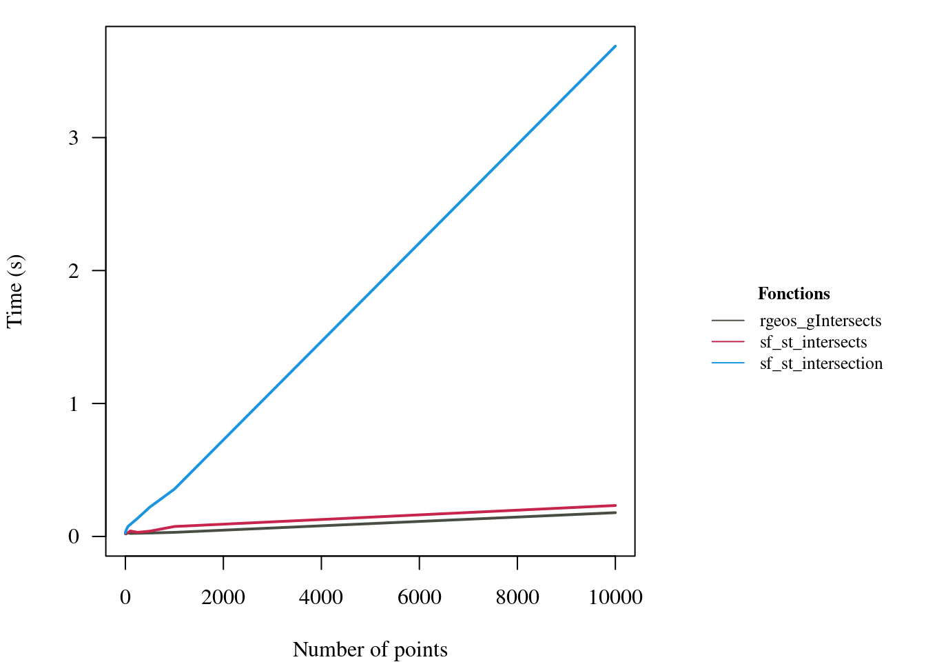 # Visualize results without gIntersectionlayout(matrix(c(1,2),ncol=2),widths=c(5,2),heights=3)par(mar=c(4,4,1,1),family="serif",las=1)#plot(res2$rgeos_gIntersects~res2$n,type='l',lwd=2,col=cols[2],ylim=c(0,max(res2[,c(3,5,6)])),xlab='Number of points',ylab='Time (s)')lines(res2$sf_st_intersects~res2$n,lwd=2,col=cols[4])lines(res2$sf_st_intersection~res2$n,lwd=2,col=cols[5])# Legendpar(mar=c(0,0,0,0),family="serif")eplot()legend(x='center',legend=as.character(colnames(res1)[-c(1,2,4)]),bty='n',lty=1,col=cols[-c(1,3)],seg.len=2,cex=0.8,title=expression(bold('Fonctions')))