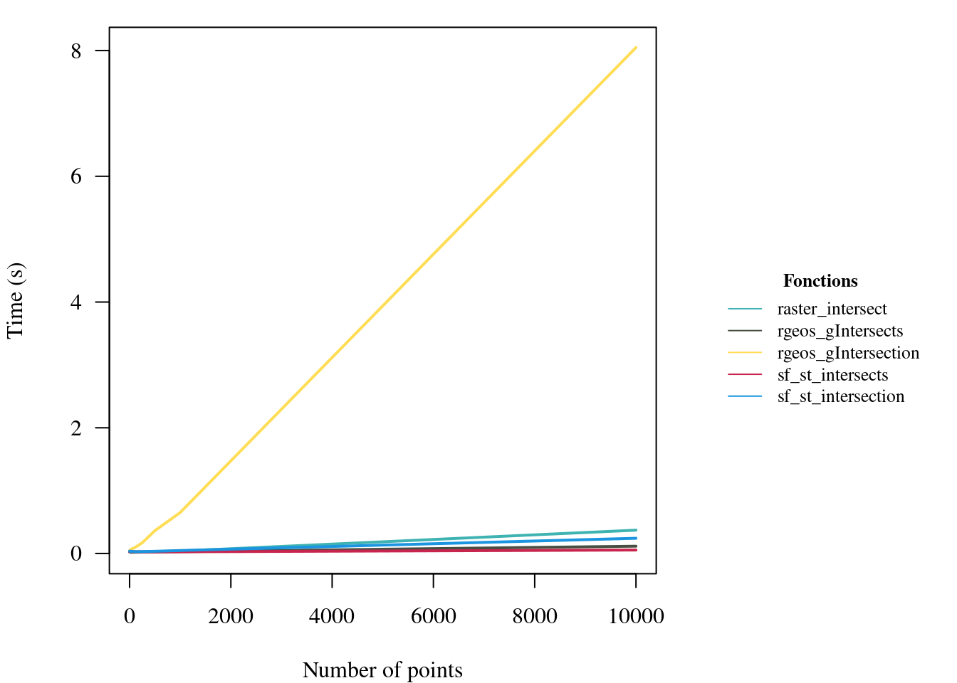 # Visualize resultscols<-c("#3fb3b2","#484f42","#ffdd55","#c7254e","#1b95e0")layout(matrix(c(1,2),ncol=2),widths=c(5,2),heights=3)par(mar=c(4,4,1,1),family="serif",las=1)#plot(res1$raster_intersect~res1$n,type='l',lwd=2,col=cols[1],ylim=c(0,max(res1[,2:6])),xlab='Number of points',ylab='Time (s)')lines(res1$rgeos_gIntersects~res1$n,lwd=2,col=cols[2])lines(res1$rgeos_gIntersection~res1$n,lwd=2,col=cols[3])lines(res1$sf_st_intersects~res1$n,lwd=2,col=cols[4])lines(res1$sf_st_intersection~res1$n,lwd=2,col=cols[5])# Legendpar(mar=c(0,0,0,0),family="serif",las=1)eplot()legend(x='center',legend=as.character(colnames(res1)[-1]),bty='n',lty=1,col=cols,seg.len=2,cex=0.8,title=expression(bold('Fonctions')))