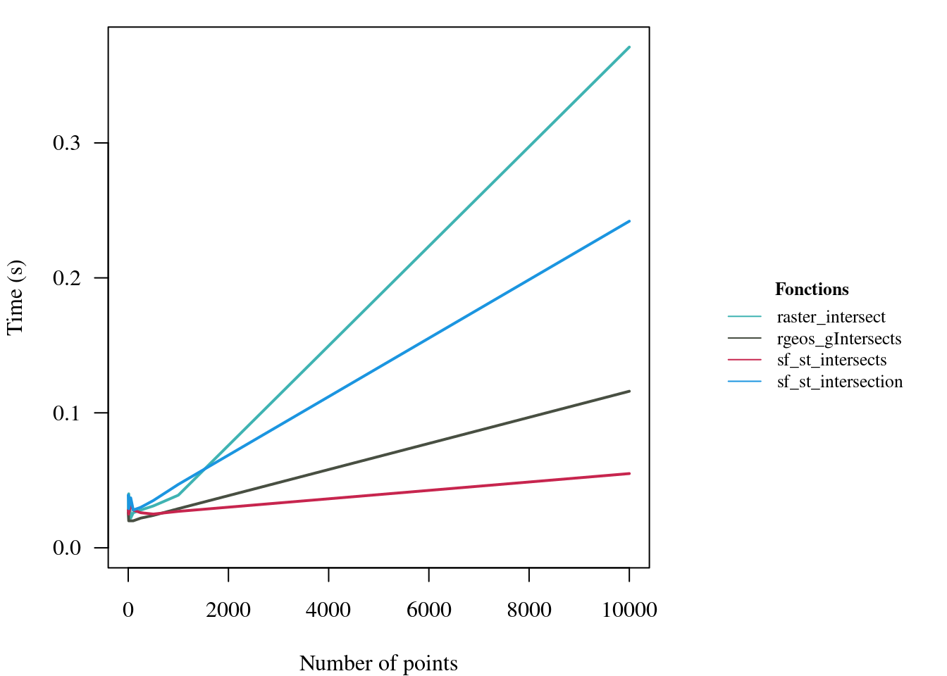 # Visualize results without gIntersectionlayout(matrix(c(1,2),ncol=2),widths=c(5,2),heights=3)par(mar=c(4,4,1,1),family="serif",las=1)#plot(res1$raster_intersect~res1$n,type='l',lwd=2,col=cols[1],ylim=c(0,max(res1[,c(2,3,5,6)])),xlab='Number of points',ylab='Time (s)')lines(res1$rgeos_gIntersects~res1$n,lwd=2,col=cols[2])lines(res1$sf_st_intersects~res1$n,lwd=2,col=cols[4])lines(res1$sf_st_intersection~res1$n,lwd=2,col=cols[5])# Legendpar(mar=c(0,0,0,0),family="serif")eplot()legend(x='center',legend=as.character(colnames(res1)[-c(1,4)]),bty='n',lty=1,col=cols[-3],seg.len=2,cex=0.8,title=expression(bold('Fonctions')))