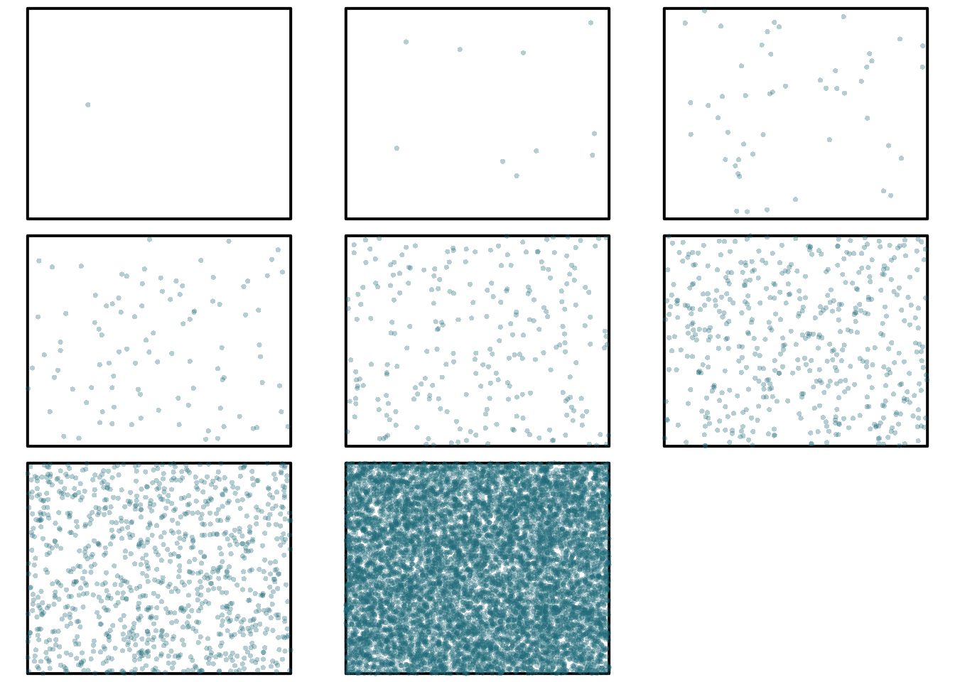 # Number of samplessamp<-c(1,10,50,100,250,500,1000,10000)nSamp<-length(samp)# Names of points samplessampNames<-paste0('Pt',samp)sampNames#R> [1] "Pt1" "Pt10" "Pt50" "Pt100" "Pt250" "Pt500" "Pt1000"#R> [8] "Pt10000"# Random points for all samplesfor(iin1:nSamp){assign(x=sampNames[i],value=data.frame(lon=runif(n=samp[i],min=lonmin,max=lonmax),lat=runif(n=samp[i],min=latmin,max=latmax)))}# We now have nSamp new objects with randomly generated coordinatesls()#R> [1] "A" "bb" "cellsize" "eplot" "grid" "gridSF" #R> [7] "gridSP" "i" "latmax" "latmin" "lonmax" "lonmin" #R> [13] "nSamp" "projSpat" "Pt1" "Pt10" "Pt100" "Pt1000" #R> [19] "Pt10000" "Pt250" "Pt50" "Pt500" "res1" "res2" #R> [25] "samp" "sampNames"# Let's now create spatial objects with those coordinates for use with the `sp` packagesampNamesSP<-paste0(sampNames,'SP')for(iin1:nSamp){assign(x=sampNamesSP[i],value=SpatialPoints(coords=get(sampNames[i]),proj4string=CRS(projSpat)))}# Visualize thempar(mfrow=c(3,3))for(iin1:nSamp){par(mar=c(0,0,0,0))plot(bb,lwd=2)points(get(sampNamesSP[i]),cex=0.75,col='transparent',bg='#1e6b7955',pch=21)}